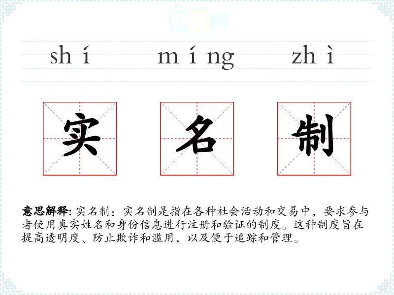 实名制:实名制是指在各种社会活动和交易中,要求参与者使用真实姓名和身份信息进行注册和验证的制度。这种制度旨在提高透明度、防止欺诈和滥用,以及便于追踪和管理。