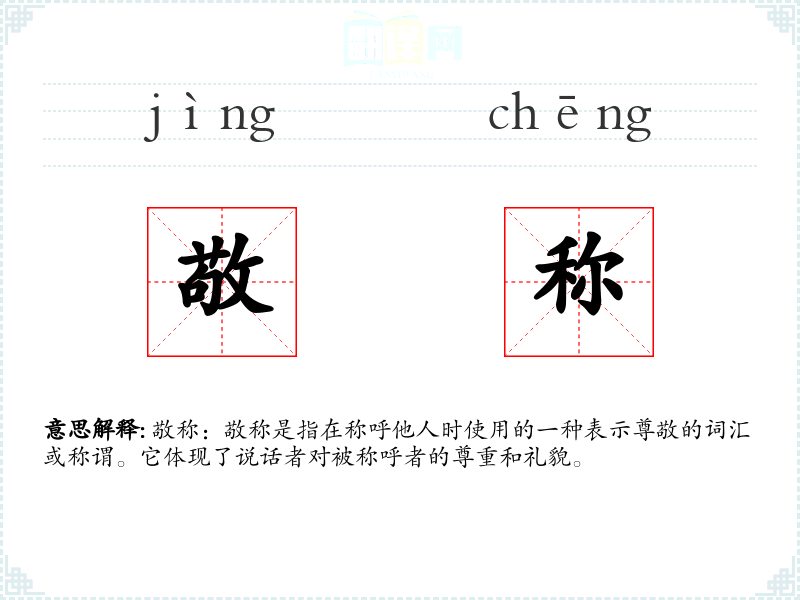 敬称:敬称是指在称呼他人时使用的一种表示尊敬的词汇或称谓。它体现了说话者对被称呼者的尊重和礼貌。