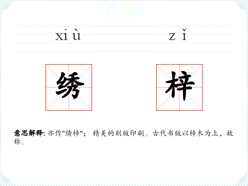 亦作"绣梓"; 精美的刻版印刷。古代书版以梓木为上,故称。