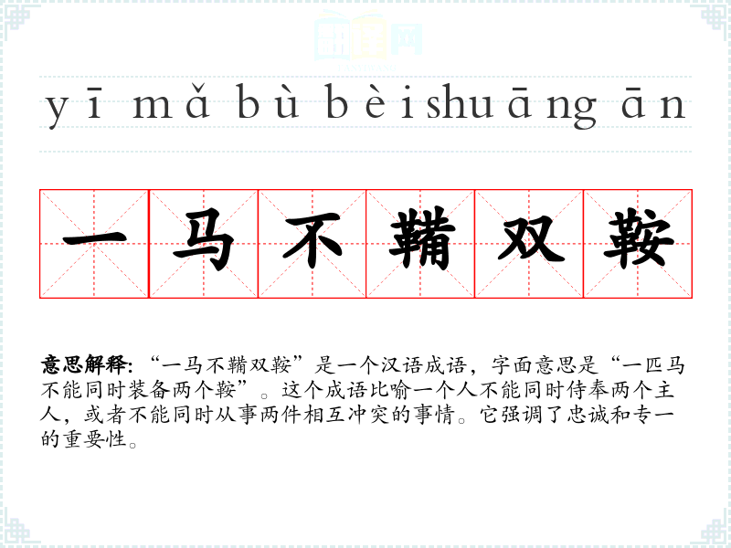 这个成语的词源较为明确,源自**古代的马术和军事文化。在古代战争中,一匹马通常只装备一个鞍,以便于骑手操控。随着时间的推移,这个概念被引申为比喻人的忠诚和专一。