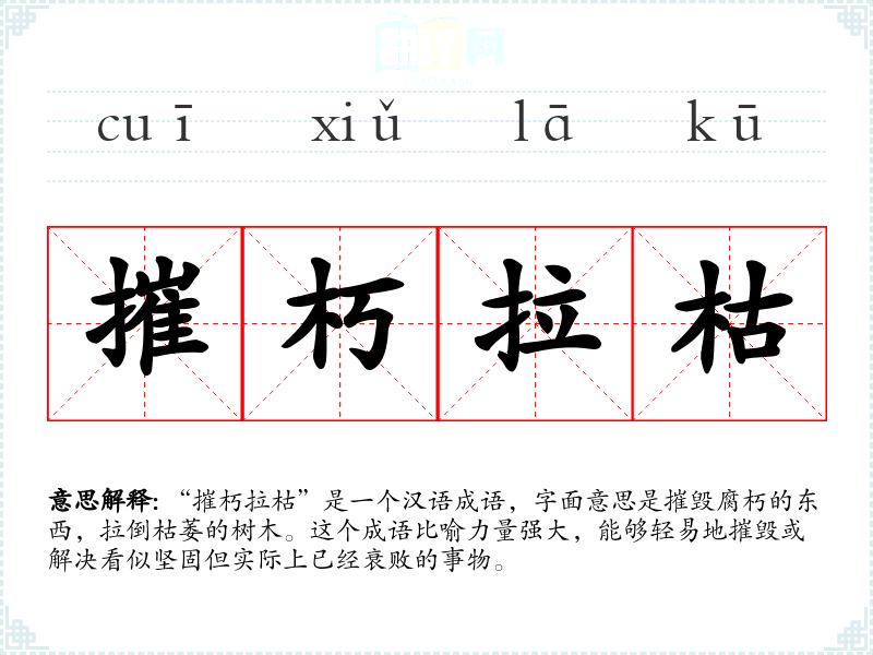 “摧朽拉枯”是一个汉语成语,字面意思是摧毁腐朽的东西,拉倒枯萎的树木。这个成语比喻力量强大,能够轻易地摧毁或解决看似坚固但实际上已经衰败的事物。