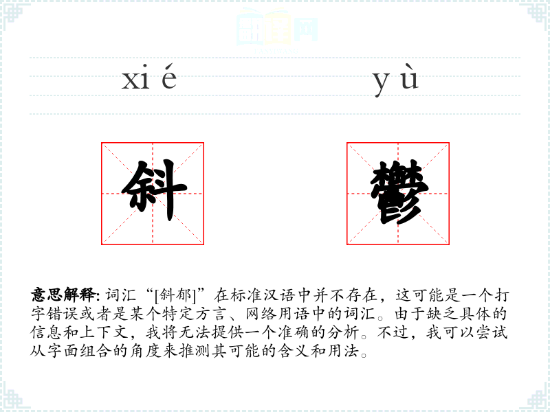 词汇“[斜郁]”在标准汉语中并不存在,这可能是一个打字错误或者是某个特定方言、网络用语中的词汇。由于缺乏具体的信息和上下文,我将无法提供一个准确的分析。不过,我可以尝试从字面组合的角度来推测其可能的含义和用法。