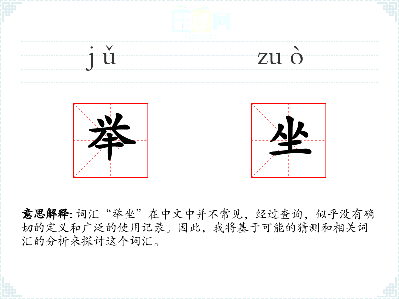 由于“举坐”不是一个标准的汉语词汇,我们可以尝试从字面意思来解释: