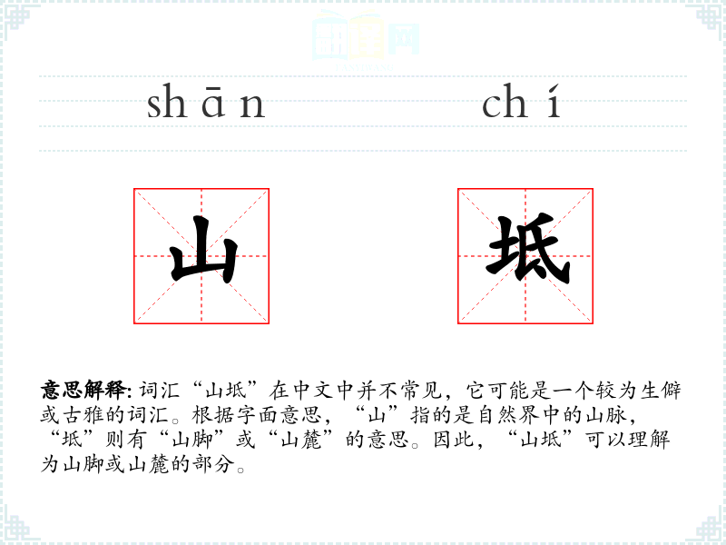 词汇“山坻”在中文中并不常见,它可能是一个较为生僻或古雅的词汇。根据字面意思,“山”指的是自然界中的山脉,“坻”则有“山脚”或“山麓”的意思。因此,“山坻”可以理解为山脚或山麓的部分。