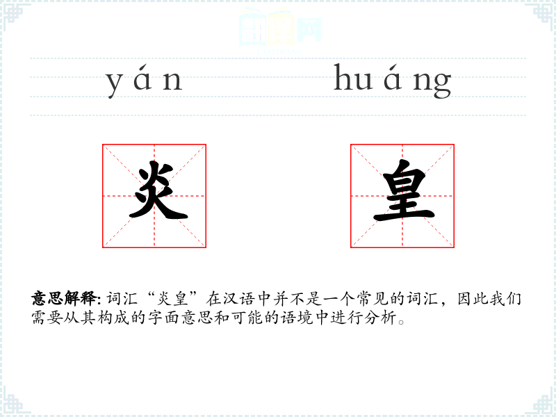 词汇“炎皇”在汉语中并不是一个常见的词汇,因此我们需要从其构成的字面意思和可能的语境中进行分析。