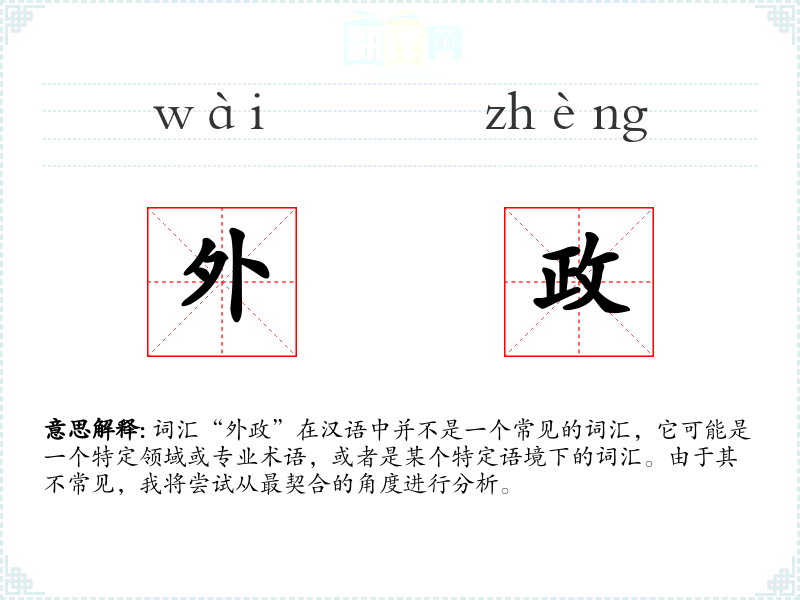 词汇“外政”在汉语中并不是一个常见的词汇,它可能是一个特定领域或专业术语,或者是某个特定语境下的词汇。由于其不常见,我将尝试从最契合的角度进行分析。