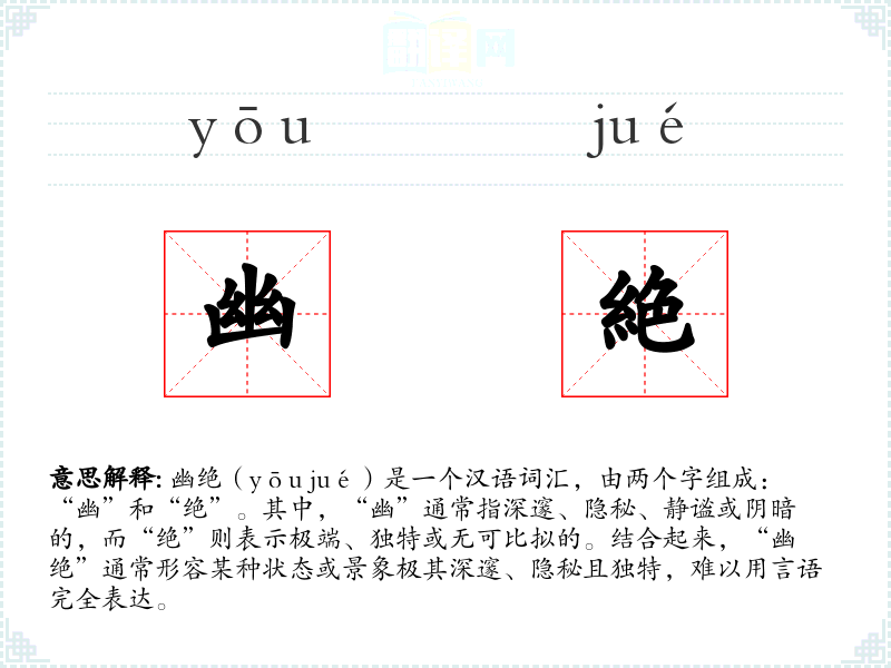 幽绝(yōu jué)是一个汉语词汇,由两个字组成:“幽”和“绝”。其中,“幽”通常指深邃、隐秘、静谧或阴暗的,而“绝”则表示极端、独特或无可比拟的。结合起来,“幽绝”通常形容某种状态或景象极其深邃、隐秘且独特,难以用言语完全表达。