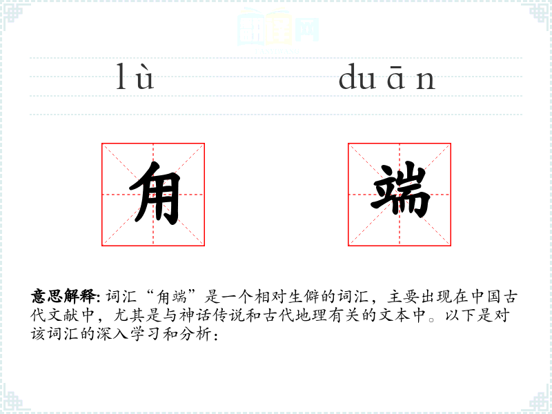 词汇“甪端”是一个相对生僻的词汇,主要出现在*古代文献中,尤其是与神话传说和古代地理有关的文本中。以下是对该词汇的深入学和分析: