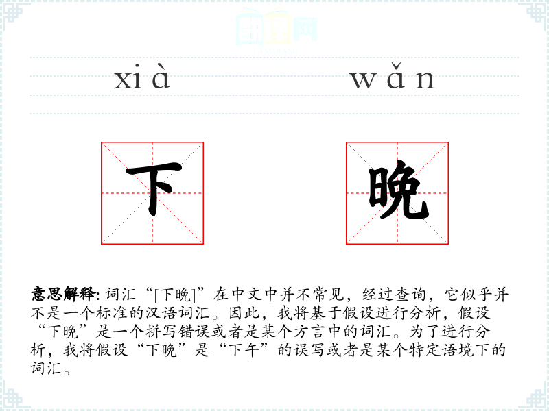 - 尽管“下晩”不是一个标准词汇,通过假设和分析,我们可以看到它在语境中的潜在用途和意义。在语言学*和表达中,理解词汇的正确用法和语境是非常重要的。
