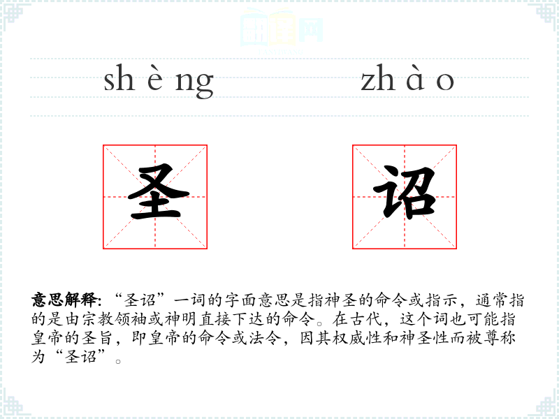 “圣诏”一词的字面意思是指神圣的命令或指示,通常指的是由领袖或神明直接下达的命令。在古代,这个词也可能指的圣旨,即**的命令或法令,因其权威性和神圣性而被尊称为“圣诏”。