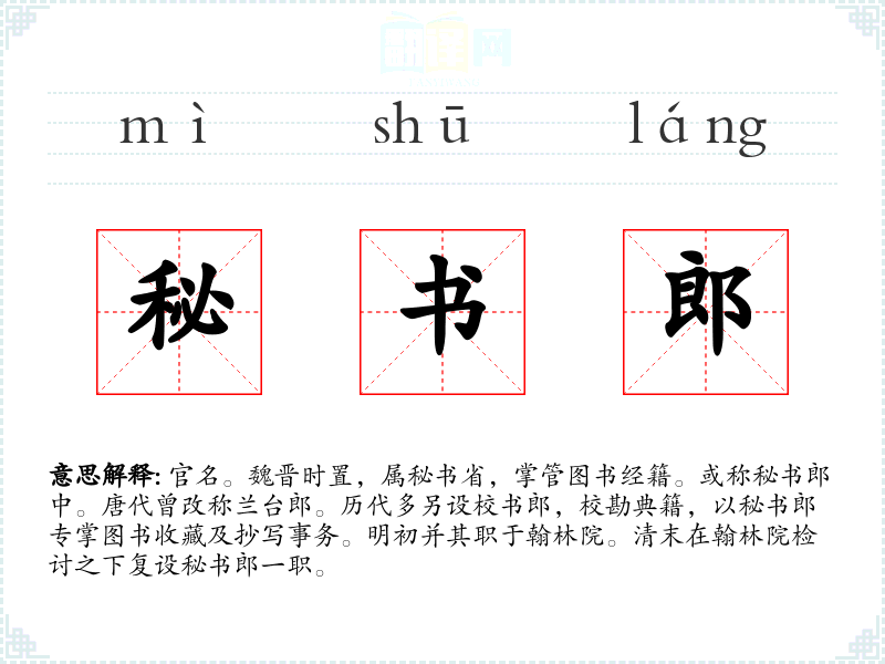 官名。魏晋时置,属秘书省,掌管图书经籍。或称秘书郎中。唐代曾改称兰台郎。历代多另设校书郎,校勘典籍,以秘书郎专掌图书收藏及抄写事务。明初并其职于翰林院。清末在翰林院检讨之下复设秘书郎一职。