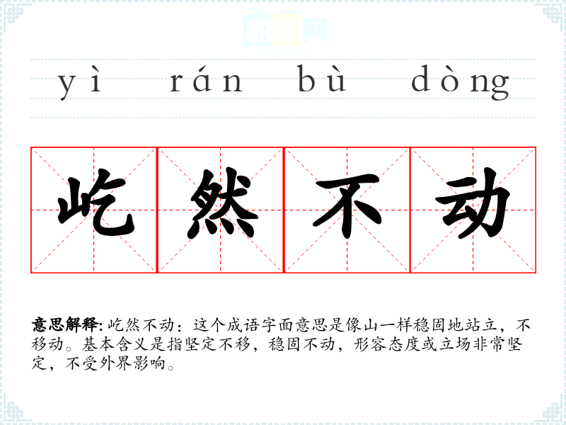 屹然不动:这个成语字面意思是像山一样稳固地站立,不移动。基本含义是指坚定不移,稳固不动,形容态度或立场非常坚定,不受外界影响。