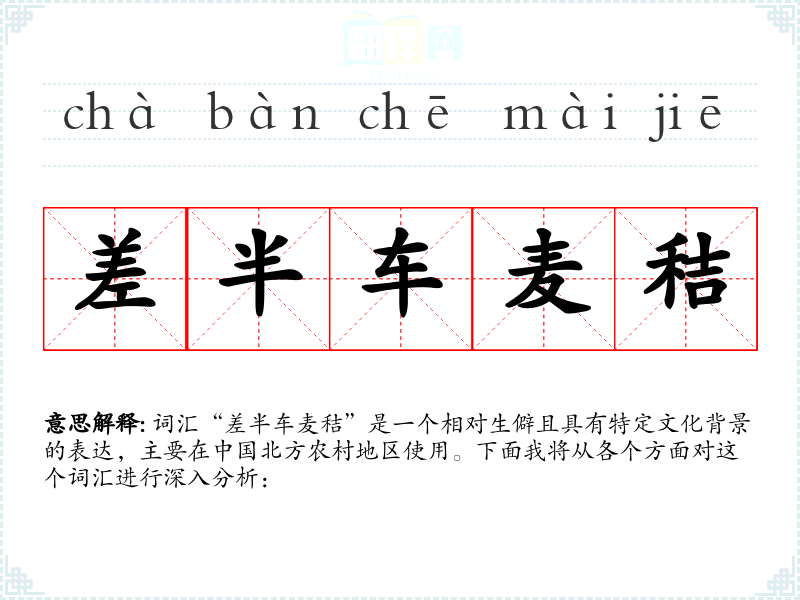 词汇“差半车麦秸”是一个相对生僻且具有特定文化背景的表达,主要在中国北方农村地区使用。下面我将从各个方面对这个词汇进行深入分析: