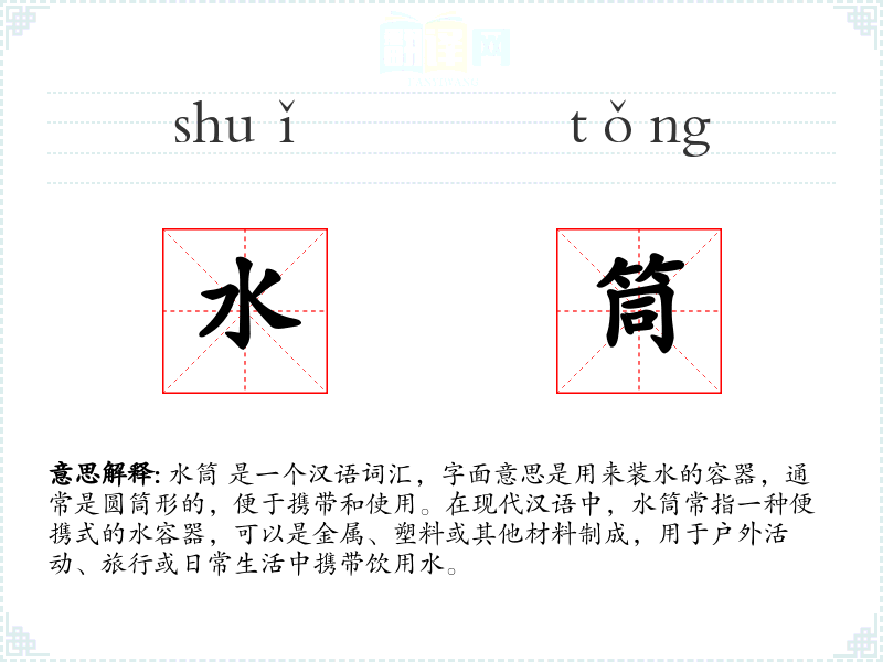 水筒 是一个汉语词汇,字面意思是用来装水的容器,通常是圆筒形的,便于携带和使用。在现代汉语中,水筒常指一种便携式的水容器,可以是金属、塑料或其他材料制成,用于户外活动、旅行或日常生活中携带饮用水。