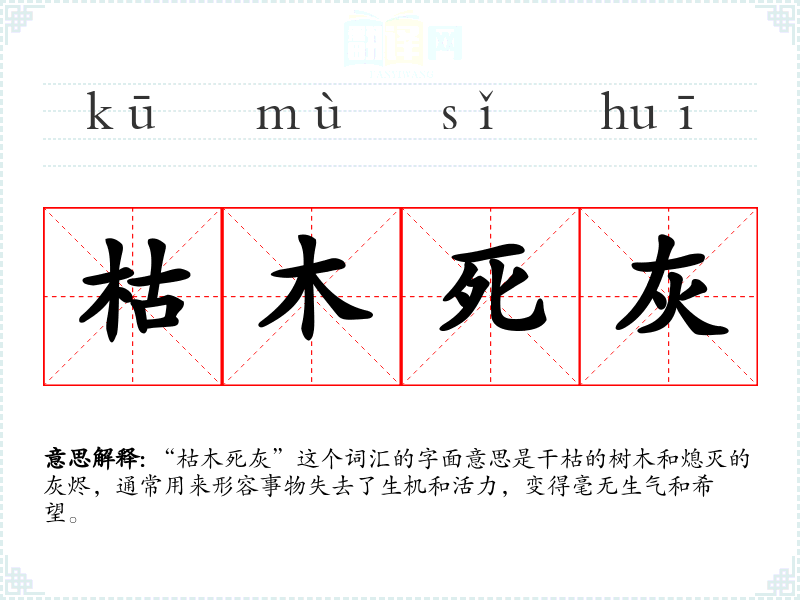 “枯木死灰”这个词汇的字面意思是干枯的树木和熄灭的灰烬,通常用来形容事物失去了生机和活力,变得毫无生气和希望。