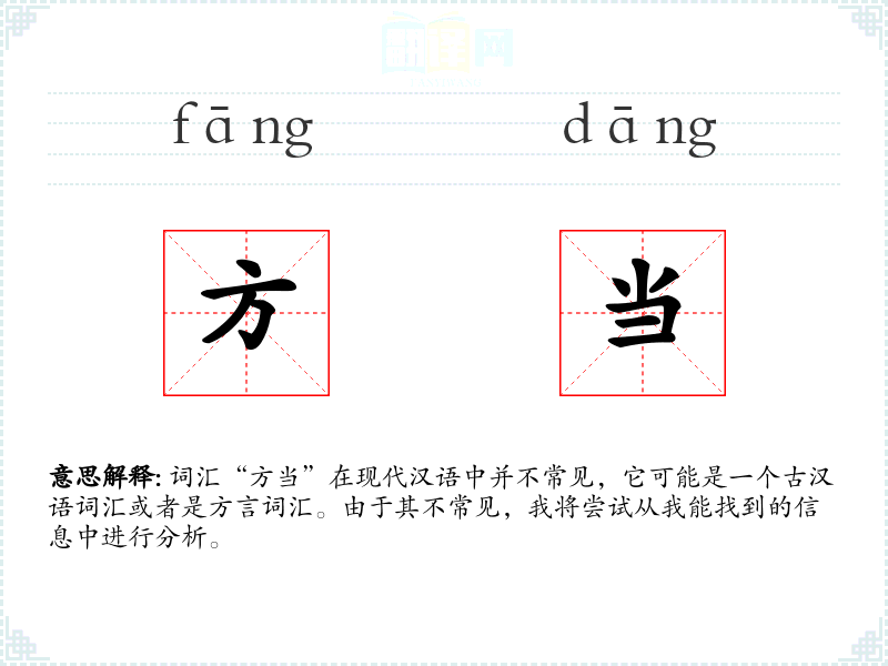 词汇“方当”在现代汉语中并不常见,它可能是一个古汉语词汇或者是方言词汇。由于其不常见,我将尝试从我能找到的信息中进行分析。