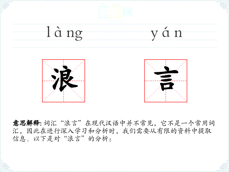 “浪言”字面意思是指轻浮、不严肃的言语,或者是没有根据、不负责任的言论。它通常带有贬义,指的是那些不经过深思熟虑就随意说出口的话。