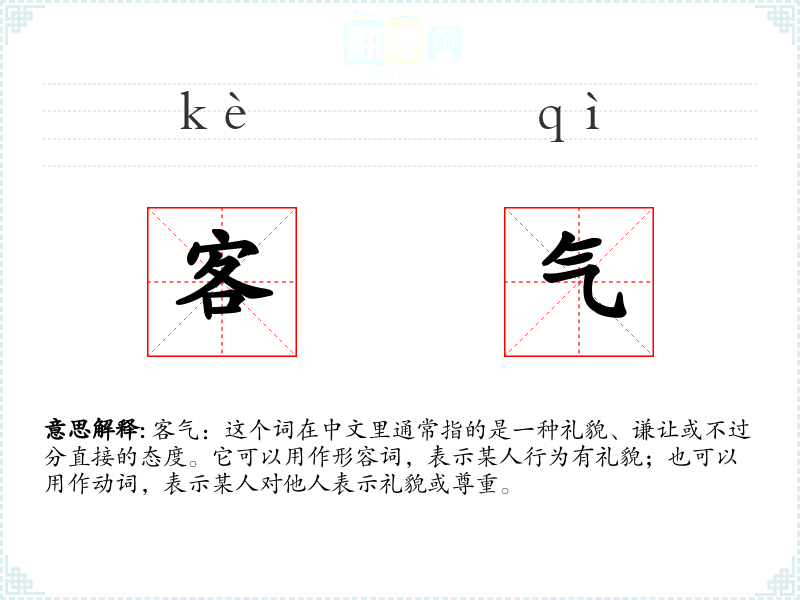 客气:这个词在中文里通常指的是一种礼貌、谦让或不过分直接的态度。它可以用作形容词,表示某人行为有礼貌;也可以用作动词,表示某人对他人表示礼貌或尊重。