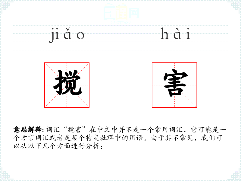 词汇“搅害”在中文中并不是一个常用词汇,它可能是一个方言词汇或者是某个特定社群中的用语。由于其不常见,我们可以从以下几个方面进行分析: