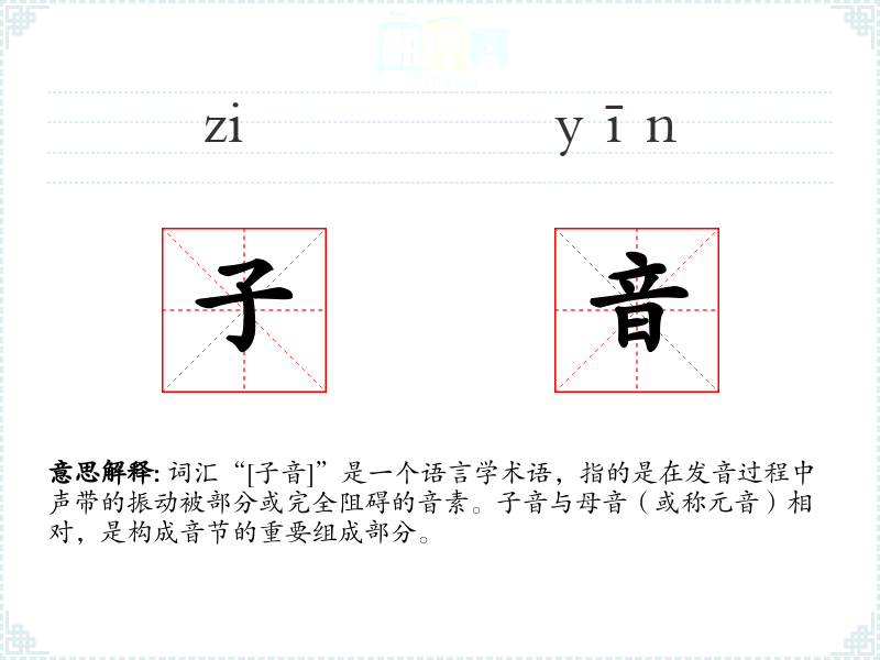 - 同义词:辅音(在某些语言学文献中,“子音”和“辅音”可以互换使用)