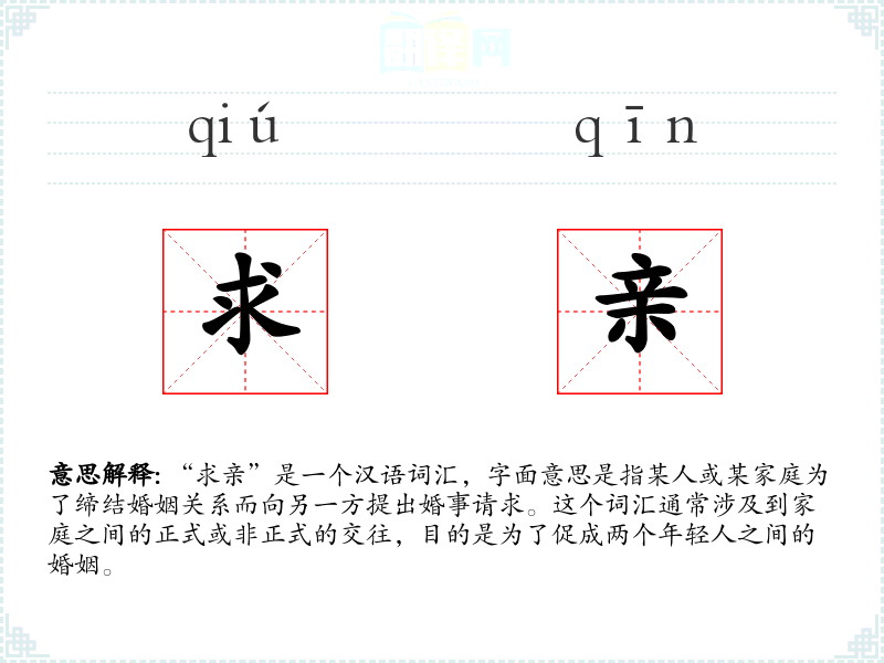 “求亲”是一个汉语词汇,字面意思是指某人或某家庭为了缔结婚姻关系而向另一方提出婚事请求。这个词汇通常涉及到家庭之间的正式或非正式的交往,目的是为了促成两个年轻人之间的婚姻。