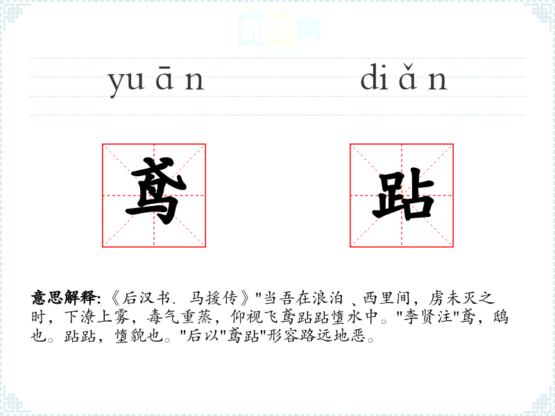 《后汉书.马援传》"当吾在浪泊﹑西里间,虏未灭之时,下潦上雾,毒气重蒸,仰视飞鸢跕跕墯水中。"李贤注"鸢,鸱也。跕跕,墯貌也。"后以"鸢跕"形容路远地恶。