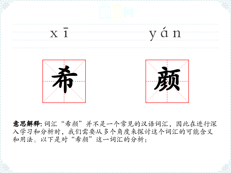 词汇“希颜”并不是一个常见的汉语词汇,因此在进行深入学习和分析时,我们需要从多个角度来探讨这个词汇的可能含义和用法。以下是对“希颜”这一词汇的分析: