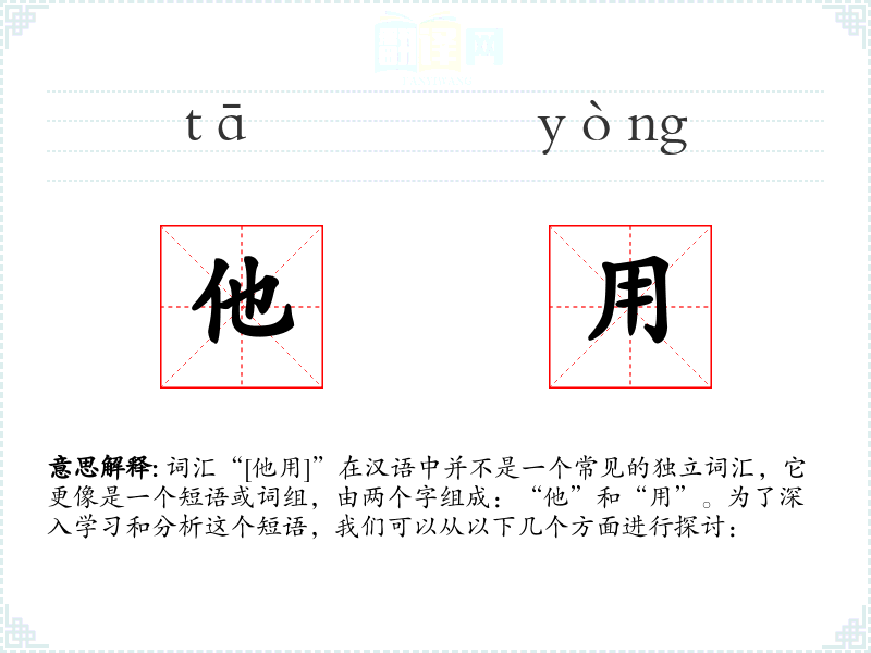 - 字面意思和基本含义:短语“他用”通常表示某人(他)使用或利用某物或某种方法。这里的“他”是一个代词,指代男性或性别不明确的第三人称个体,“用”表示使用、利用的动作。