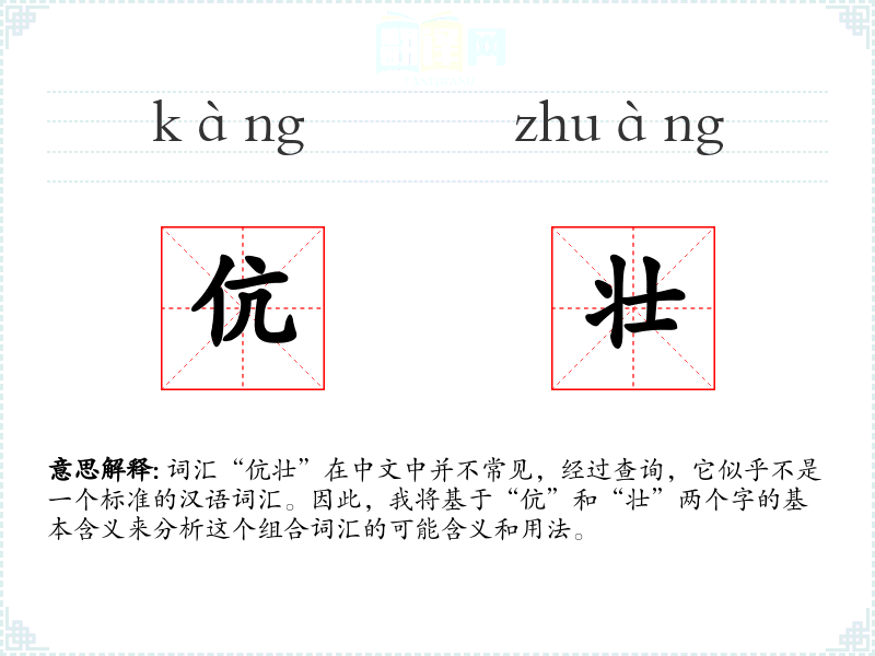 词汇“伉壮”在中文中并不常见,经过查询,它似乎不是一个标准的汉语词汇。因此,我将基于“伉”和“壮”两个字的基本含义来分析这个组合词汇的可能含义和用法。