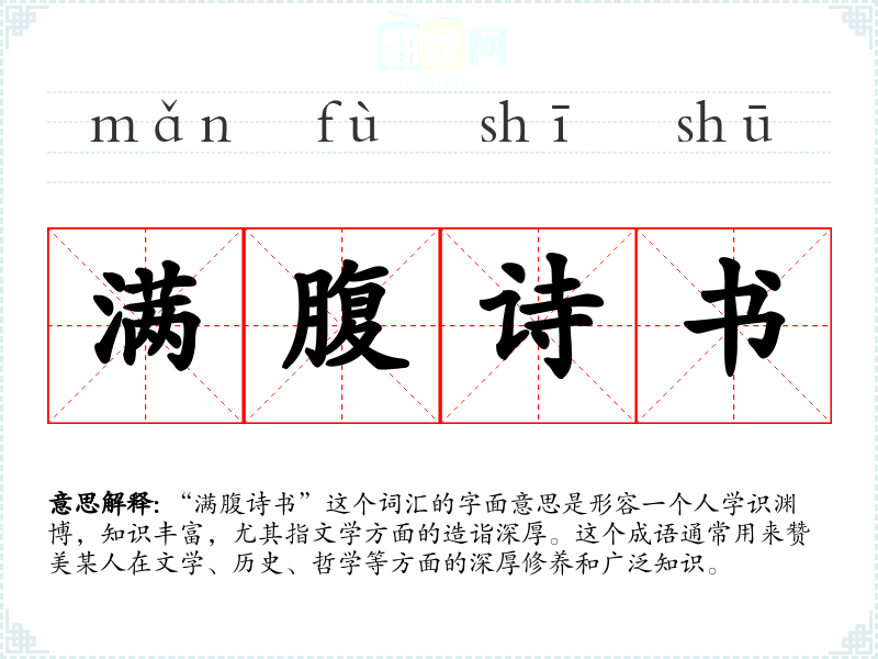 “满腹诗书”这个词汇的字面意思是形容一个人学识渊博,知识丰富,尤其指文学方面的造诣深厚。这个成语通常用来赞美某人在文学、历史、哲学等方面的深厚修养和广泛知识。