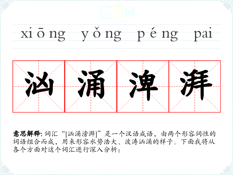 词汇“[汹涌滂湃]”是一个汉语成语,由两个形容词性的词语组合而成,用来形容水势浩大、波涛汹涌的样子。下面我将从各个方面对这个词汇进行深入分析: