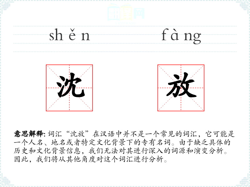 词汇“沈放”在汉语中并不是一个常见的词汇,它可能是一个人名、地名或者特定文化背景下的专有名词。由于缺乏具体的历史和文化背景信息,我们无法对其进行深入的词源和演变分析。因此,我们将从其他角度对这个词汇进行分析。