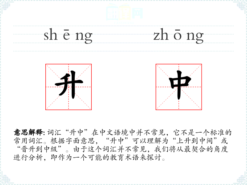 词汇“升中”在中文语境中并不常见,它不是一个标准的常用词汇。根据字面意思,“升中”可以理解为“上升到中间”或“晋升到中级”。由于这个词汇并不常见,我们将从最契合的角度进行分析,即作为一个可能的教育术语来探讨。