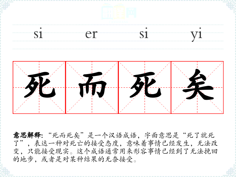 “死而死矣”是一个汉语成语,字面意思是“死了就死了”,表达一种对死亡的接受态度,意味着事情已经发生,无法改变,只能接受现实。这个成语通常用来形容事情已经到了无法挽回的地步,或者是对某种结果的无奈接受。