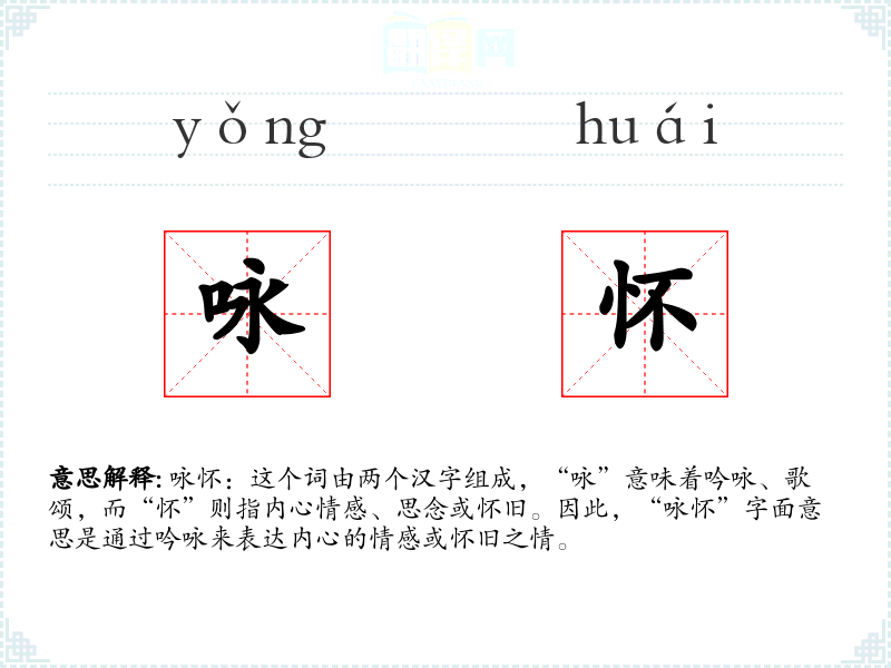 咏怀:这个词由两个汉字组成,“咏”意味着吟咏、歌颂,而“怀”则指内心情感、思念或怀旧。因此,“咏怀”字面意思是通过吟咏来表达内心的情感或怀旧之情。