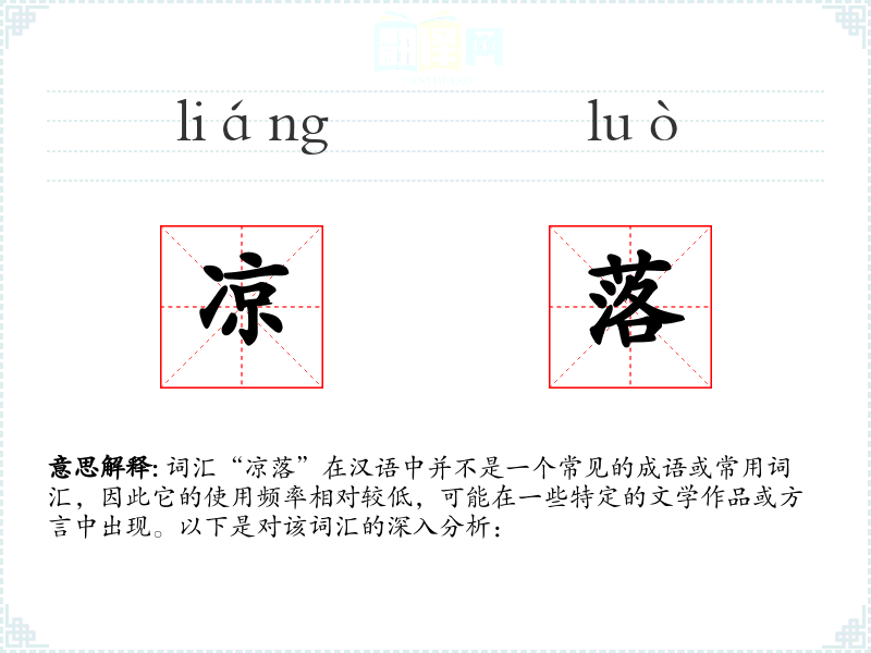 词汇“凉落”在汉语中并不是一个常见的成语或常用词汇,因此它的使用频率相对较低,可能在一些特定的文学作品或方言中出现。以下是对该词汇的深入分析: