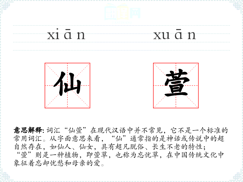 - 由于“仙萱”不是一个常用词汇,其词源和演变不详,可能是由“仙”和“萱”两个字组合而成的新词。