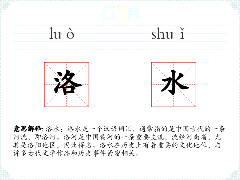 洛水作为一个词汇,不仅代表了一条河流,更承载了丰富的文化和历史意义。在语言学*和表达中,理解这样的词汇可以帮助我们更深入地了解和欣赏**文化。