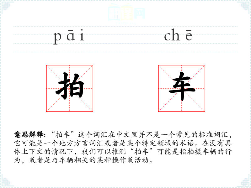 “拍车”这个词汇在中文里并不是一个常见的标准词汇,它可能是一个地方方言词汇或者是某个特定领域的术语。在没有具体上下文的情况下,我们可以推测“拍车”可能是指拍摄车辆的行为,或者是与车辆相关的某种操作或活动。