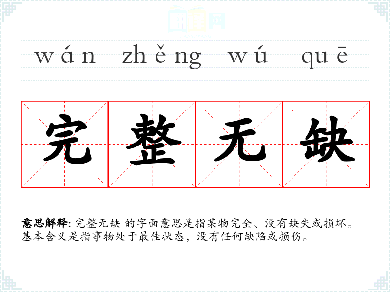 完整无缺 的字面意思是指某物完全、没有缺失或损坏。基本含义是指事物处于最佳状态,没有任何缺陷或损伤。
