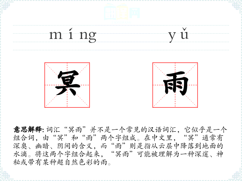 词汇“冥雨”并不是一个常见的汉语词汇,它似乎是一个组合词,由“冥”和“雨”两个字组成。在中文里,“冥”通常有深奥、幽暗、阴间的含义,而“雨”则是指从云层中降落到地面的水滴。将这两个字组合起来,“冥雨”可能被理解为一种深邃、神秘或带有某种超自然色彩的雨。