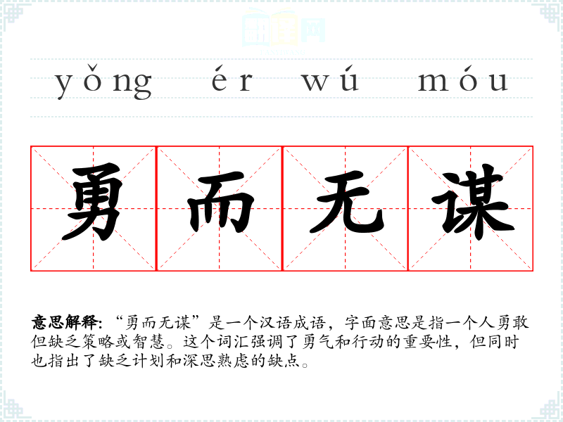 “勇而无谋”是一个汉语成语,字面意思是指一个人勇敢但缺乏策略或智慧。这个词汇强调了勇气和行动的重要性,但同时也指出了缺乏计划和深思熟虑的缺点。