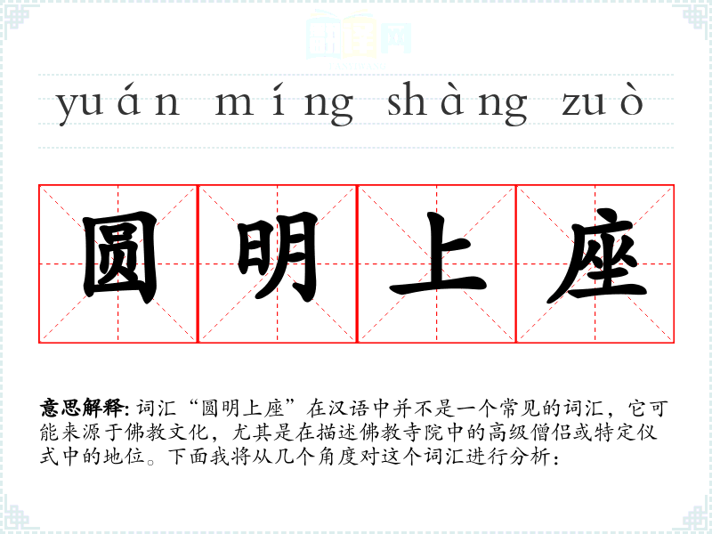 词汇“圆明上座”在汉语中并不是一个常见的词汇,它可能来源于文化,尤其是在描述寺院中的高级僧侣或特定仪式中的地位。下面我将从几个角度对这个词汇进行分析: