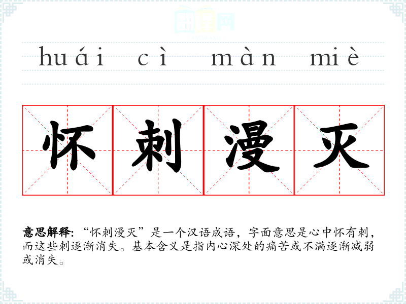 “怀刺漫灭”是一个汉语成语,字面意思是心中怀有刺,而这些刺逐渐消失。基本含义是指内心深处的痛苦或不满逐渐减弱或消失。