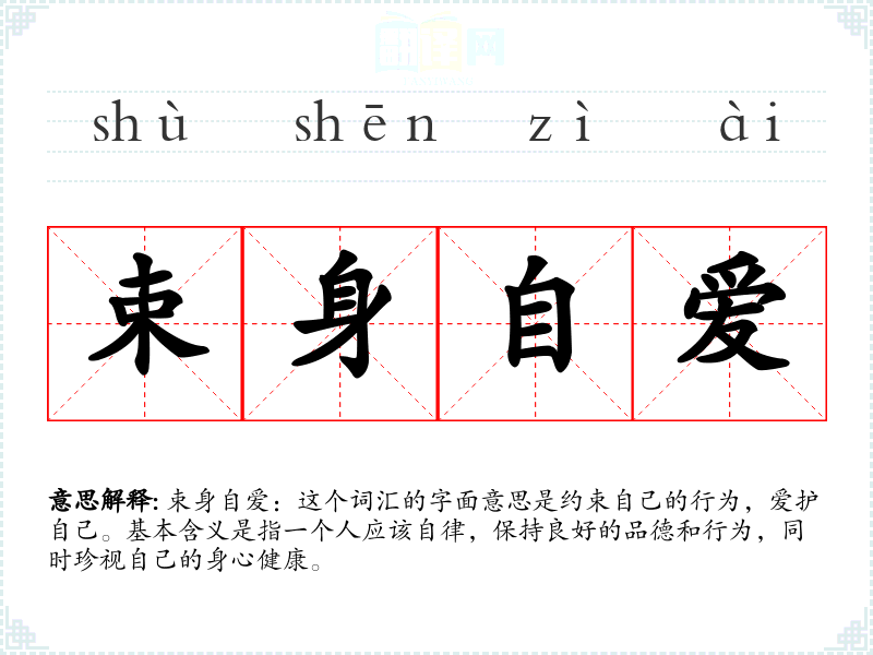 束身自爱:这个词汇的字面意思是约束自己的行为,爱护自己。基本含义是指一个人应该自律,保持良好的品德和行为,同时珍视自己的身心健康。