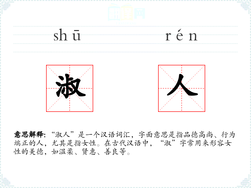“淑人”是一个汉语词汇,字面意思是指品德高尚、行为端正的人,尤其是指女性。在古代汉语中,“淑”字常用来形容女性的美德,如温柔、贤惠、善良等。