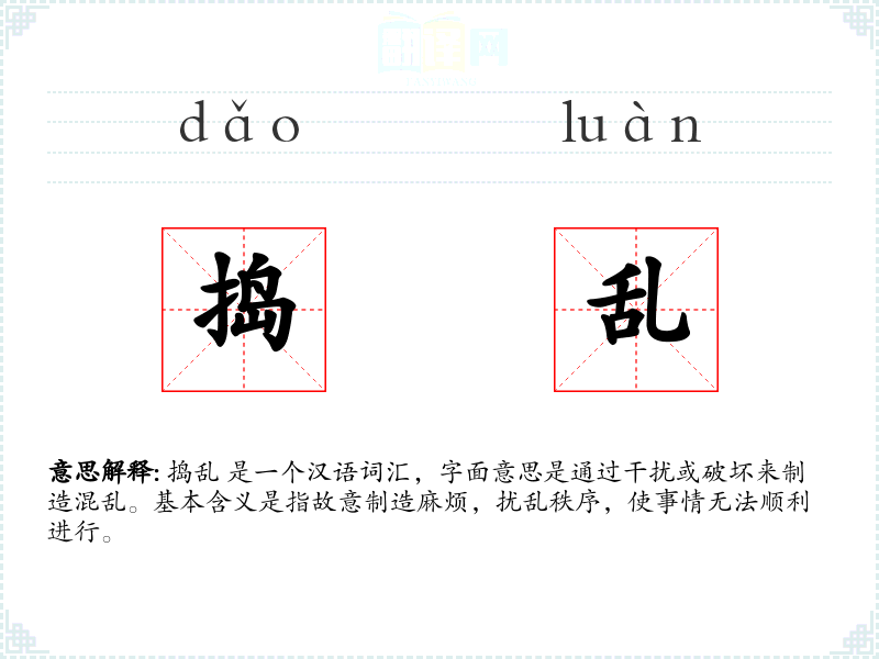 捣乱 是一个汉语词汇,字面意思是通过干扰或破坏来制造混乱。基本含义是指故意制造麻烦,扰乱秩序,使事情无法顺利进行。