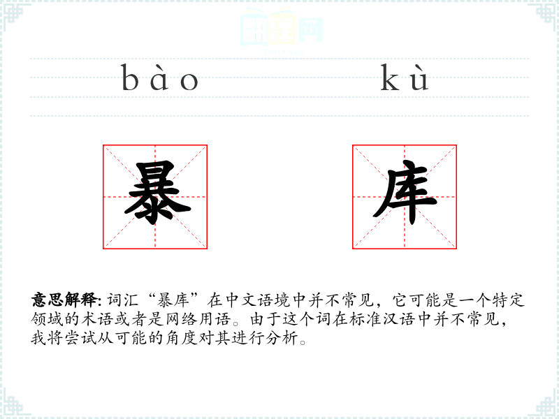 词汇“暴库”在中文语境中并不常见,它可能是一个特定领域的术语或者是网络用语。由于这个词在标准汉语中并不常见,我将尝试从可能的角度对其进行分析。