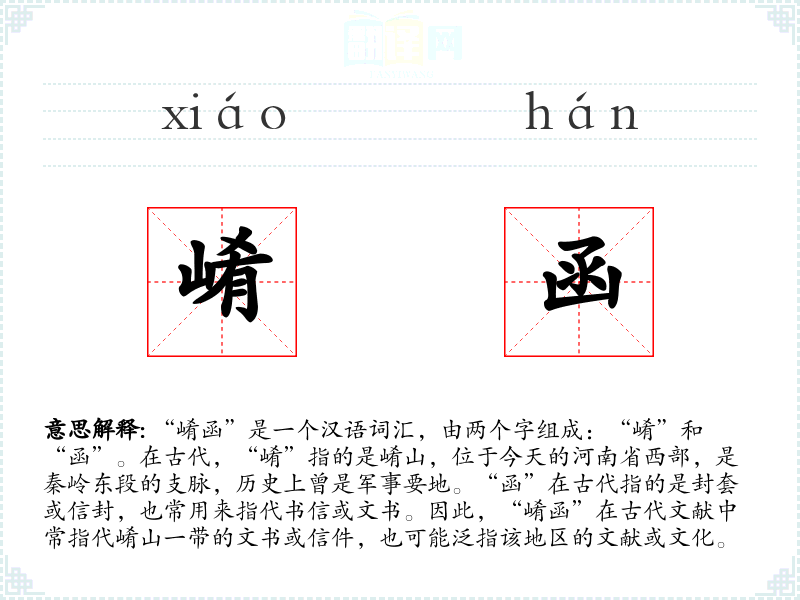“崤”字源自崤山,而“函”字源自古代的封套或信封。随着时间的推移,“崤函”这个词汇可能已经从具体的地点和物品扩展到了更广泛的文化和历史意义。