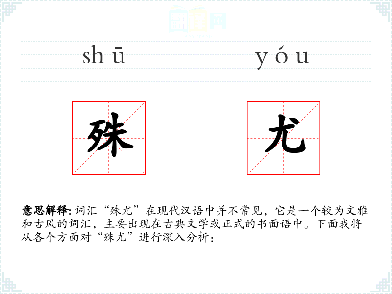 词汇“殊尤”在现代汉语中并不常见,它是一个较为文雅和古风的词汇,主要出现在古典文学或正式的书面语中。下面我将从各个方面对“殊尤”进行深入分析: